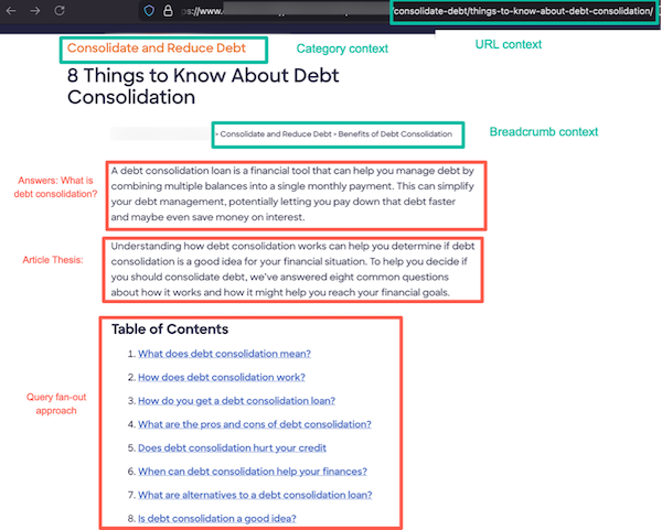 The example article covered here gets more right than wrong. The query/answer structure is solid. Every H2 is a question a real user would type, and the answer follows immediately in the first paragraph. The table of contents signals genuine topic authority by mapping the full query fan-out around debt consolidation. And where answers include even more structure via how-to steps, bulleted lists, tables, etc., the content becomes faster to scan for humans and cheaper to parse for machines.